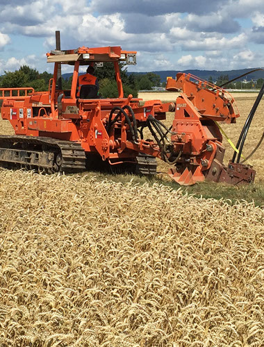 Wir ziehen Gräben nach Maß! Für Kabel, Rohre, Drainagen und andere Leitungen in den unterschiedlichsten Tiefen und Breiten, je nach Erfordernis – genauer und schneller als ein Bagger es kann. Ein querlaufendes Transportband fördert das kleinkörnige Aushubmaterial auf die gewünschte Seite.